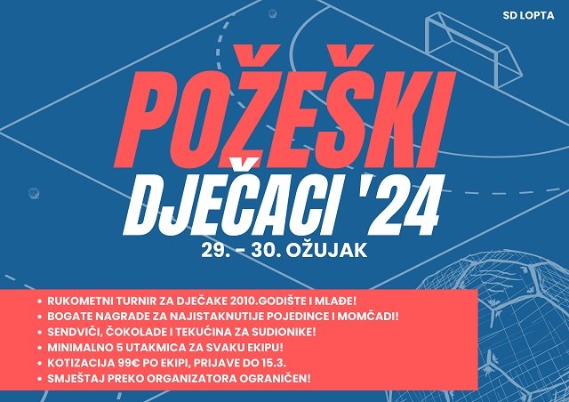 POŽEGA – U Sportskoj dvorani Tomislav Pirc 29. i 30. ožujka održat će se 19. izdanje Rukometnog turnira “Požeški dječaci” na kojem pravo nastupa imaju igrači rođeni 2010. i mlađi. Organizatori su Sportsko društvo „Lopta“ i Rukometni klub Požega, a generalni pokrovitelj Grad Požega.