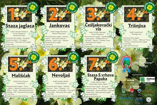 VELIKA – Jedna od najpoznatijih i najdugovječnijih planinarskih manifestacija u regiji koja gotovo pola stoljeća spaja outdoor turizam, aktivan život i ljepote prirode i ove je godine, na najljepši način najavila početak sezone i dolazak novog godišnjeg doba. Počeli su 44. Papučki jaglaci, planinarski pozdrav proljeću u organizaciji HPD Sokolovac Požega i suorganizaciji TZ Zlatni Papuk i Parka prirode Papuk.