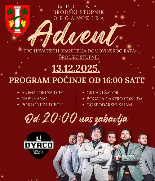 Ovogodišnji Advent u Općini Brodski Stupnik otvara vrata u subotu, 13. prosinca, od 16 sati, pozivajući vas da im se pridružite u programu punom sadržaja za sve generacije. Najmlađe će razveseliti pokloni koje će im uručiti Dalal ekipa u blagdanskim maskotama, a u prostorijama Društvenog doma čeka ih i napuhanac za bezbrižnu zabavu. Želeći predstaviti vrijedne obrtnike i poduzetnike, domaćini organiziraju i Gospodarski sajam na kojem će nastupiti 15-ak izlagača. Idealna je to prilika da otkrijete lokalne proizvode i nađete savršene blagdanske poklone za svoje bližnje. Kako je bit blagdana u ugodnom druženju i dobrom glazbenom programu, večer je rezervirana za popularni đakovački bend Dyaco koji jamči sjajnu zabavu i kvalitetnu set listu sastavljenu od svih žanrova domaće glazbe.