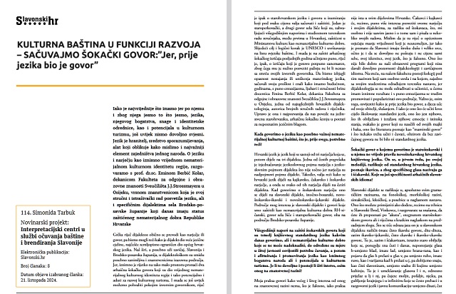 Dokaz da profesionalno novinarstvo u Hrvatskoj i dalje ima snagu, smisao i ljude koji ga nose je upravo objavljen Zbornik s odabranim nagrađenim projektima tijekom 2024., među kojima je i članak Sačuvajmo šokački govor objavljen na portalu Slavonski hr., u okviru projekta Interpretacijski centri u službi očuvanja baštine i brendiranja Slavonije.