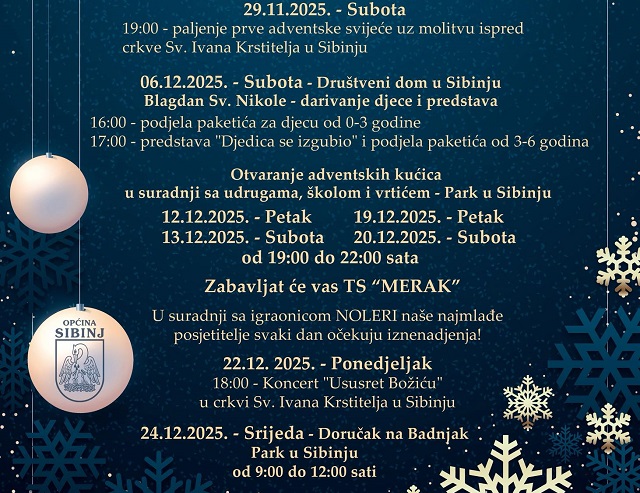 Uz priliku da se uvjerite u kreativnost vrijednih malih i velikih ruku, bit će to prilika i za kupovinu darova, poput kolača i unikatnih rukotvorina, jer iako smisao Božića nije u materijalnom, na što podsjećaju organizatori blagdanske priče, sitnici poklonjenoj od srca, svi se raduju. Zabava uz tamburaše kao i niz svakodnevnih iznenađenja za najmlađe, najljepši dio godine učinit će još ljepšim, baš kao i tradicionalni Božićni koncert 22. prosinca i zajednički doručak na Badnjak, jer smisao blagdana je u dijeljenju. Želite li osjetiti Božić kakav je nekad bio, navratite u Sibinj, Božićna priča čeka s dobrodošlicom!
