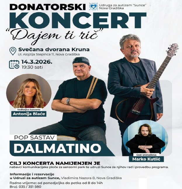 NOVA GRADIŠKA – Udruga za autizam Sunce Nova Gradiška organizira donatorski koncert s ciljem nabave komunikacijske ploče za senzorni park. Nakon što su njihov rad, entuzijazam i predanost na podizanju svijesnosti o autizmu, do sada prepoznali Sergej Ćetković, Petar Grašo, Goran Karan, Zorica Kondža, Matija Cvek, ove godine učinit će to grupa Dalmatino i Marko Kutlić.Koncert pod nazivom “Dajem ti rič” zakazan je za subotu, 14. ožujka u Svečanoj dvorani “Kruna”.