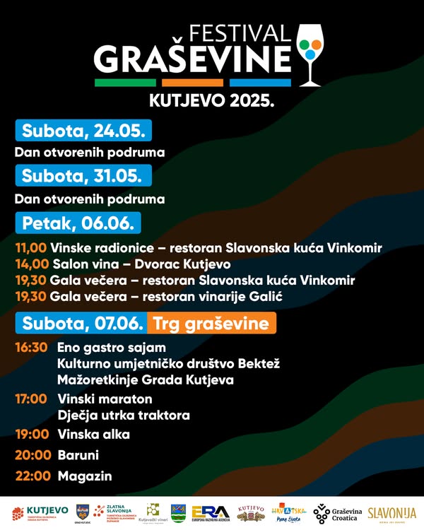 I ove godine u sklopu Festivala održat će se sve popularnija Vinska alka, Vinski maraton i Dječja utrka traktora za najmlađe koji su na programu 7. lipnja 2025. godine. Sve započinje od 16,30 sati. Program će otvoriti Kulturno-umjetničko društvo Bektež i Mažoretkinje grada Kutjeva, a uz eno-gastro sajam i predstavljanje kutjevačkih vinara i obiteljskih gospodarstava bit će organiziran i glazbeni program. Ove godine, Kutjevčane i njihove goste rasplesat će Baruni i grupa Magazin, a ulaz na sva događanja na Trgu graševine je slobodan.