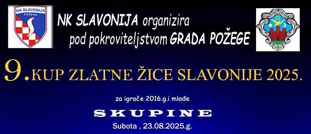POŽEGA – U subotu, 23. kolovoza 2025. godine, na terenu s umjetnom travom Sportsko-rekreacijskog centra u Požegi, održat će se deveto izdanje Nogometnog turnira “Kup Zlatne žice Slavonije 2025”.