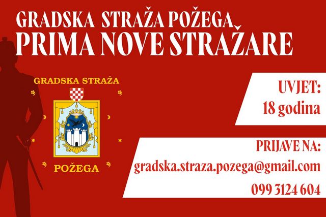 Svi zainteresirani pozvani su da se prijave i postanu dio ove posebne gradske priče. Prijave se mogu poslati na e-mail adresu gradska.straza.pozega@gmail.com ili putem kontaktnog broja 099 3124 604. Pridruživanje Gradskoj straži Požega predstavlja jedinstvenu priliku za osobni razvoj, stjecanje novih iskustava i aktivno sudjelovanje u životu zajednice.