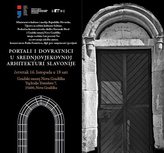 NOVA GRADIŠKA – U organizaciji Ministarstva kulture i medija i Područne konzervatorske službe Slavonski Brod, povodom obilježavanja Dana europske baštine u Republici Hrvatskoj, u četvrtak 16.10. u Gradskom muzeju Nova Gradiška bit će otvorena izložba Portali i dovratnici u srednjovjekovnoj arhitekturi Slavonije.Autor izložbe je konzervator Ratko Ivanušec, dipl.pov.umjetnosti i povijesti