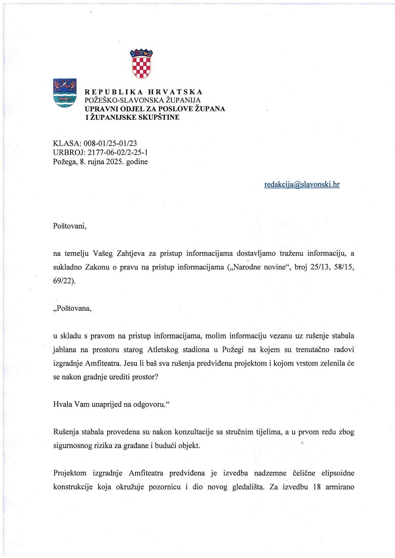 Na prostoru bivšeg atletskog stadiona u tijeku su radovi na uređenju Amfiteatra. U zamahu radova pala su i stabla jablana zeleni simbol tog prostora, što je izazvalo ogorčene reakcije dijela požeške javnosti. Kako je Požeško-slavonska županija naručitelj radova koje izvodi tvrtka Presoflex d.o.o poslali smo upit naručitelju vezano uz razloge sječe jablana i planove za novo ozelenjavanje tog prostora.