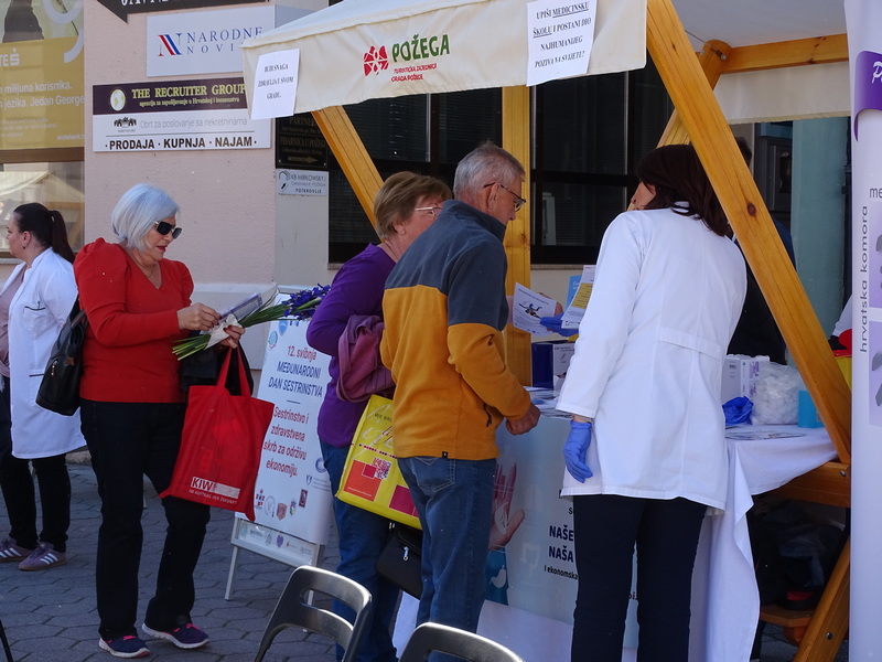 Uz isticanje značaja preventivnih pregleda svoj obol javnozdrastvenoj akciji dale su medicinske sestre i tehničari koji su nastavili u Požegi obilježavati Međunarodni dan sestrinstva. Međunarodni dan sestrinstva diljem svijeta obilježava se 12. svibnja u spomen na rođenje Florence Nightingale, utemeljiteljice modernog sestrinstva. Obilježavanje Međunarodnog dana sestrinstva u Požegi započelo je prethodnog vikenda simpozijem “Štamparevi dani”, nastavilo se koncertom Pjevačkog zbora medicinskih sestara Immaculata u crkvi Sveto Lovre, a danas je održana javnozdravstvena akcija u kojoj su sudjelovale sve medicinske sestre i tehničari iz svih županijskih zdravstvenih i zdravstveno socijalnih ustanova. Oni su građanima mjerili krvni tlak, glukozu u krvi te podsjećali na važnost prevenicije i ranog otkrivanja kroničnih bolesti.
