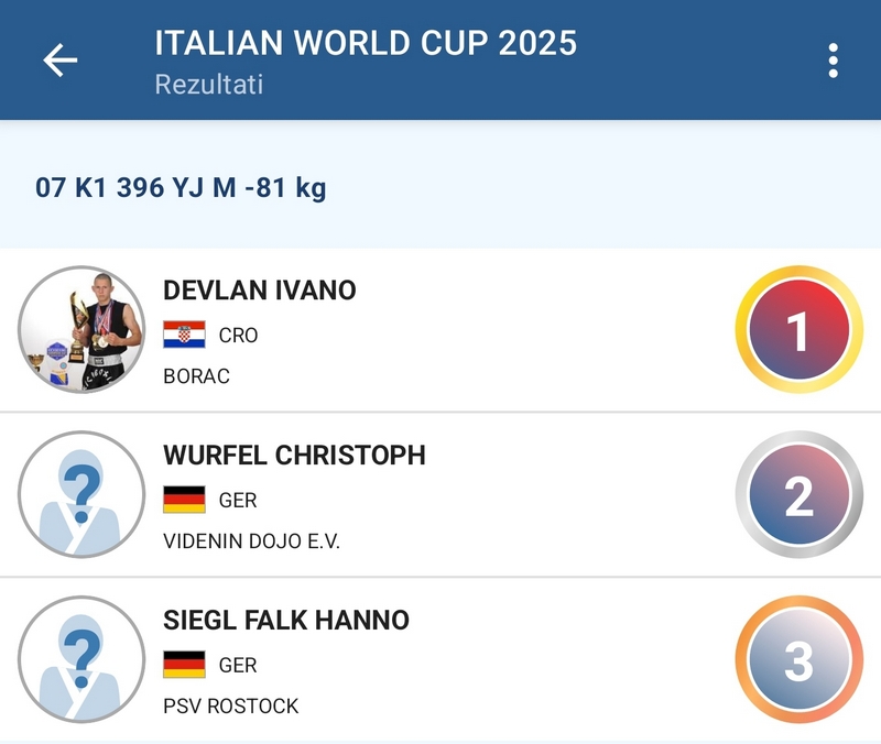 Prvi je na red došao Ivano Đevlan, koji od ove sezone nastupa u juniorima u K1. Podsjetimo, nedavno je osvojio Europski Kup u K1 u Bugarskoj, prekidom u 1. rundi. U Italiji je prvi dan u prvom kolu osigurao direktan prolaz kao nositelj kategorije. U petak ga je u finalu dočekao predstavnik iz Njemačke. Borba je krenula oštro s obje strane. Ivano u dogovoru s trenerom u 2. rundi diže tempo te u izmjeni direktom pogađa Njemca, nakon čega je suparnik pao kao pokošen! Čistim nokautom pobjeđuje inače vrsnog Kyokushin borca, te osvaja Svjetski Kup u Italiji.