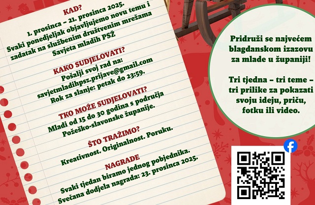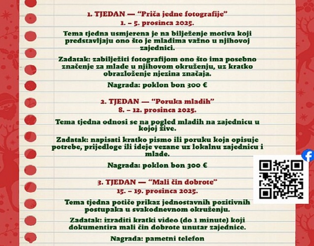 POŽEGA – Natječaj je namijenjen mladima od 15 do 30 godina s područja županije i sa zadanim temama provodit će se od 1. do 21. prosinca. Najkreativniji bit će nagrađeni vrijednim nagradama.