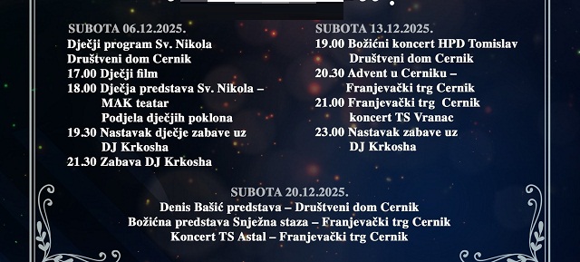 Posljednju Adventsku subotu, 20.prosinca, domaćini vam poklanjaju čak dvije predstave i koncert TS Astal, stoga, želite li u blagdane ući uz zabavne sadržaje i dobro raspoloženje, posjetite Zimsku idilu u Cerniku, mjestu “gdje počinje turizam”.