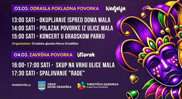 Dan kasnije, u nedjelju, 2.ožujka, na red će doći oni stariji koji će sa zabavom krenuti, a od kud drugdje, nego iz Male,praćeni dobrom energijom i članovima Gradske glazbe. Pokladni ciklus završit će u utorak, 4.veljače, tradicionalnim spaljivanjem “Rade”, krivca za svo zlo u protekloj godini. Želite li im se pridružiti, još uvijek nije kasno da osmislite alter ego ili tek nabacite osmijeh. Vesele mačkare, ionako će se pobrinuti za sve ostalo!