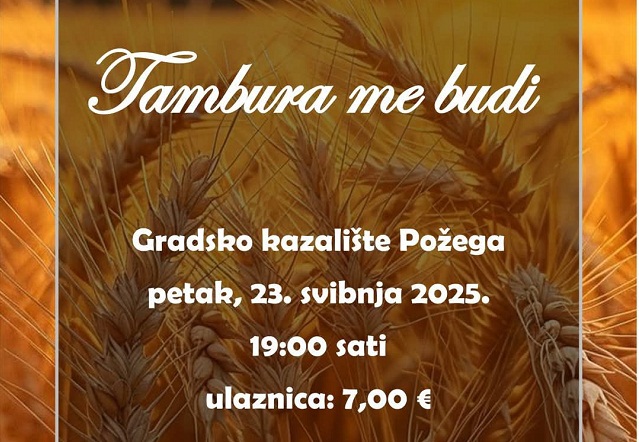 Osnažen svojim gostima, Požeški tamburaški orkestar koncertom pod nazivom „Tambura me budi“ ponovno će pokazati svoju vještinu i ljubav za tamburu. Pod vodstvom Valentina Petranovića, koji je uspješno uskladio i uvježbao članove orkestra, učenike Glazbene škole i zbor, pripremljen je raznovrstan repertoar u kojem će glazbeni doživljaj prirediti za sve ljubitelje tambura. Zapjevat će a capella uz zbor, zasvirati klasiku i pop, te prepoznatljive pjesme koje će zaisgurno zapjevati i publika.