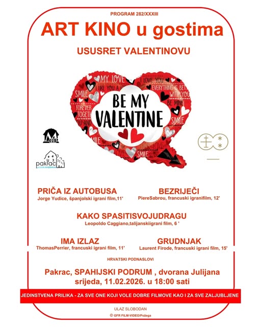 Pakračanke iPakračani od sada će moći češće imati priliku u svom gradu pogledati projekcije brojnih kvalitetnih i nagrađivanih kratkih filmova. Budući da se bliži Valentinovo, filmovi pripremljeni za srijedu, 11.2. od 18 sati u dvorani Julijana Spahijskog podruma, donose priče i emocije.