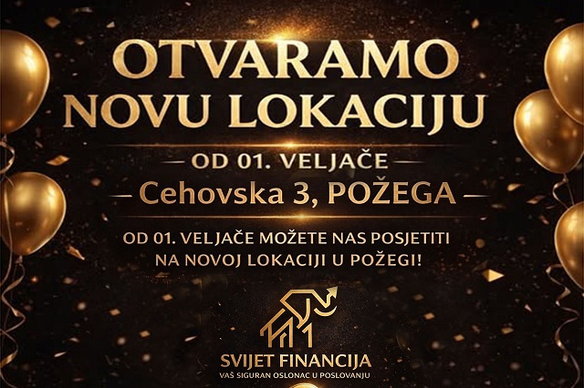 Svečano otvorenje održat će se u nedjelju, 1. veljače u 12 sati, na adresi Cehovska 3 u Požegi, a svi zainteresirani građani pozvani su da svojim dolaskom podrže ovaj novi poslovni iskorak i upoznaju se s radom servisa Svijet financija.