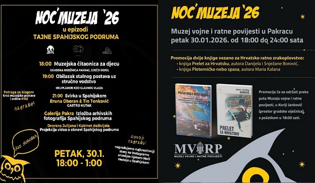 PAKRAC – Posljednji petak u siječnju već je godinama rezerviran za posebnu i najdužu muzejsku noć, kada muzeji širom zemlje otvaraju svoja vrata i pružaju priliku da muzejske postave i zbirke doživite u tajnovitom večernjem ruhu.