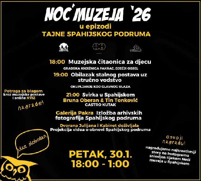 Ovogodišnja Noć muzeja u Pakracu povijesna je i donosi poseban razlog za slavlje. Muzej grada Pakraca po prvi put obilježava ovu manifestaciju u novoobnovljenom Spahijskom podrumu – Posjetiteljskom centru koji je ujedno dom prvog stalnog postava Muzeja grada Pakraca, ali i Gradske knjižnice Pakrac. Program u petak 30. siječnja počinje u 18 sati i trajati će sve do 1 sat iza ponoći, a posjetitelje očekuje najduža muzejska večer ispunjena otkrivanjem tajni Spahijskog podruma, igrom, glazbom i ugodnim druženjem uz besplatan ulaz za sve.