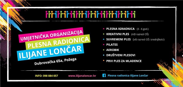 POŽEGA – Umjetnička organizacija Plesna radionica Ilijane Lončar objavljuje upise u 26. plesnu sezonu Upisi su za sve one koji žele nastaviti s plesnom edukacijom ili su odlučili pridružiti se u velikoj, funkcionalnoj plesnoj dvorani u Dubrovačkoj 65a. Osigurajte svoje mjesto putem upisnog obrasca na www.ilijanaloncar.hr