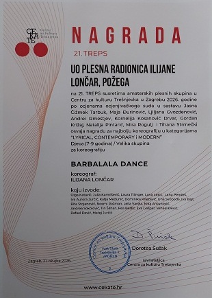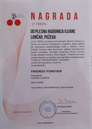 POŽEGA – UO Plesna radionica Ilijane Lončar vratila se iz Zagreba s 21. Treps gala večeri s dvije prve nagrade u kategorijama suvremeni ples djeca 7 – 9 godina s koreografijom ” Barbalala dance” i suvremeni ples duet / trio juniori 10 – 13 godina koreografija ” Friends forever”.