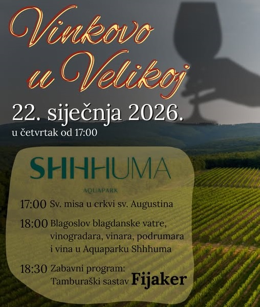 VELIKA – U četvrtak 22. siječnja održava se tradicionalno Vinkovo u Velikoj. Program se održava na prostoru Aquaparka Shhhuma (bazeni).